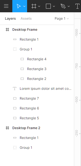 This is where all of your frames, groups and layers live. All of your images, text and shapes will be there. You can collapse groups and frames as well as show/hide and lock/unlock layers or groups from that layers panel. You can also notice that you can create multiple frames at the same time.