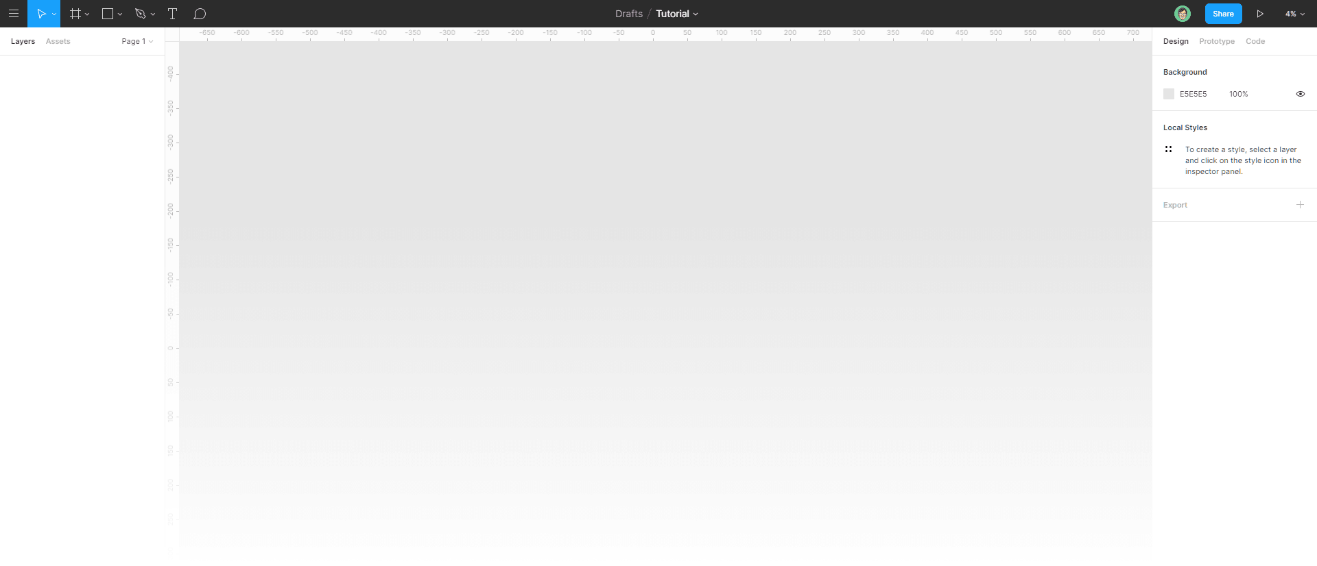 Once you create a new document in Figma or Sketch, this is the interface you will see (see below). There isn’t much, right? Figma and Sketch present only the essential to get started once you create a new file. On the top, you’ve got your tools (In order from left to right are: Move, Frame, Rectangle, Pen, Text and Comment, with more tools in each dropdown). In Sketch, those tools are all located on the top left under ‘’Insert’’. You can, however, rearrange the toolbar at the top to your liking. On the left side will be your frames/artboard and your layers, and on the right side will be some settings to change values of text, color, shapes, etc. You also have your prototyping features on a different tab on the right side.