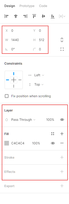 In the second red section, you will find your layer mode and your opacity, as well as your fill and stroke colors and some effects (drop shadow, inner shadow, layer blur and background blur). You can fill any shape with a solid color, a gradient (linear, radial, angular or diamond) or even an image. You can change an element’s color by clicking on the little colored square in the design panel