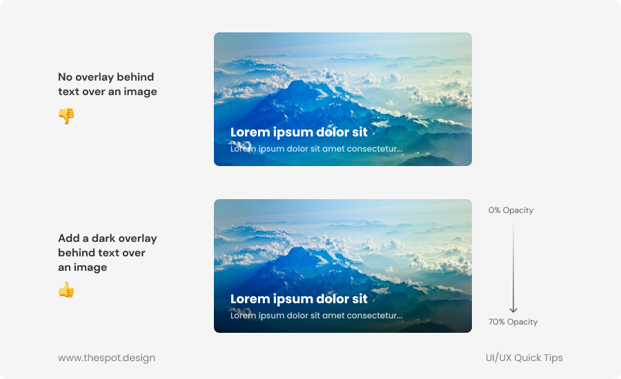 When adding text over an image (in a card or on a header, for example) consider adding a dark overlay behind your text to improve its contrast and legibility.