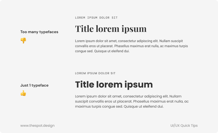 There is rarely a need to use more than one or two typefaces in a project. Using one (or two) different typefaces will make your design look more unified and more consistent. If you want to use a second typeface, choose one for titles and one for body text. You should also choose two typefaces that are different enough.