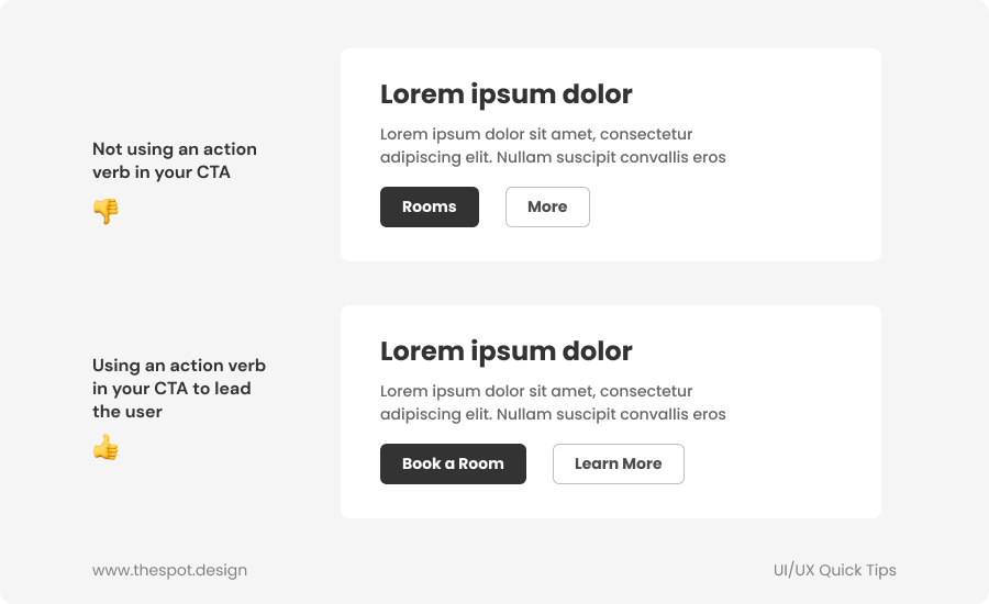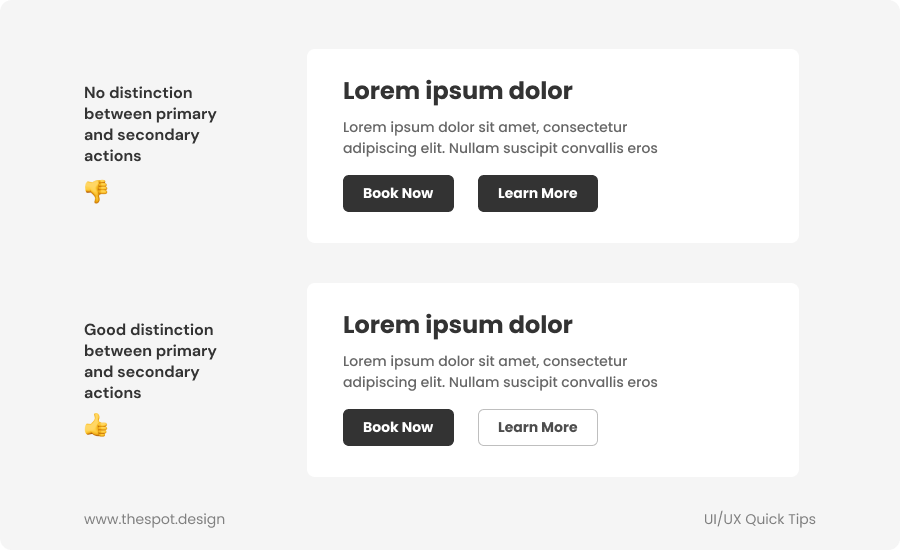 For example, you could have a header with two call-to-action buttons. One should probably be the primary action, and the second one should be a secondary action (e.g. ''Book now'', and ''Learn more''. ''Book now'' is the primary action, and ''Learn more'' is the secondary action. They should be displayed as such in your design). Generally, try to avoid having two buttons with the same hierarchy level next to each other.