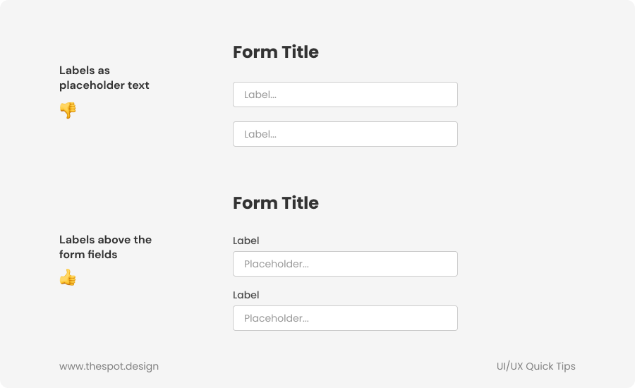 It's recommended when designing forms to keep labels above form fields so they remain visible even during and after a user is entering information in the input field, whereas the label would disappear if used as placeholder text inside the form field.