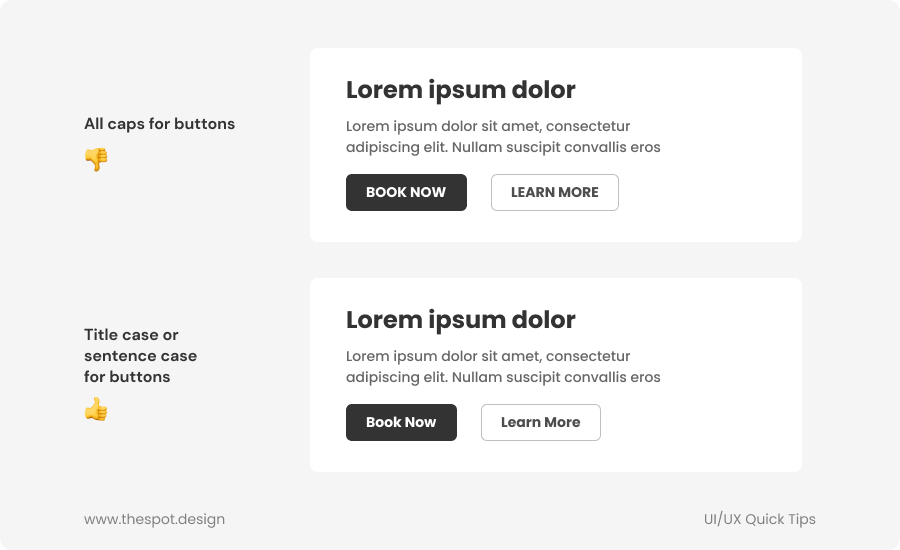 For button copy, it's recommended to use title case (capitalizing the first letter of every word) or sentence case (capitalizing the first letter of a sentence), and to avoid all caps, as it's often harder to read.