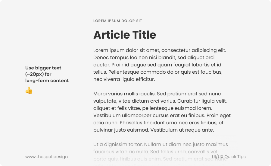 For long walls of text (e.g. blog, article, etc.) consider increasing the size of your text to around 20px. This will make text easier to read and long paragraphs of text easier to digest.