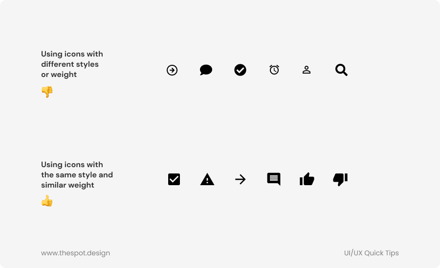 Choose one style of icons and stick to it. For example, you can choose to use outlined icons, or filled icons, but it's best to stick to that one style throughout your design.