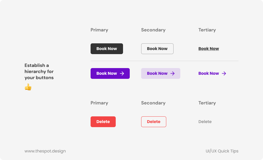 Giving your buttons proper hierarchy will make it clearer to the user what the primary actions are, this will make navigating the interface easier and clearer. Primary actions should be obvious, secondary actions should also be clear but not as prominent, and tertiary actions should be clear but unobtrusive.