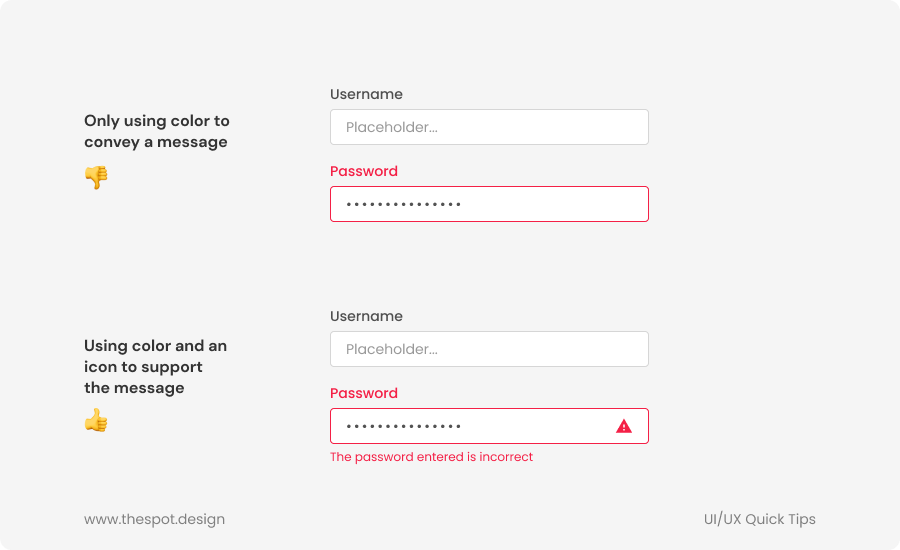 Don't rely only on colors to show important messages such as errors. Colors aren't always clear enough, and doing this could also cause issues for colorblind people. Don't assume people will understand what a color means, or that everyone will be able to see it as intended.