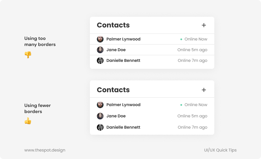 Borders can be useful to separate information, but they aren't the only way, and can very easily make a design look cluttered. A simple alternative is simply to increase the spacing between each element by a few pixels, so groups of information are clearly separated.